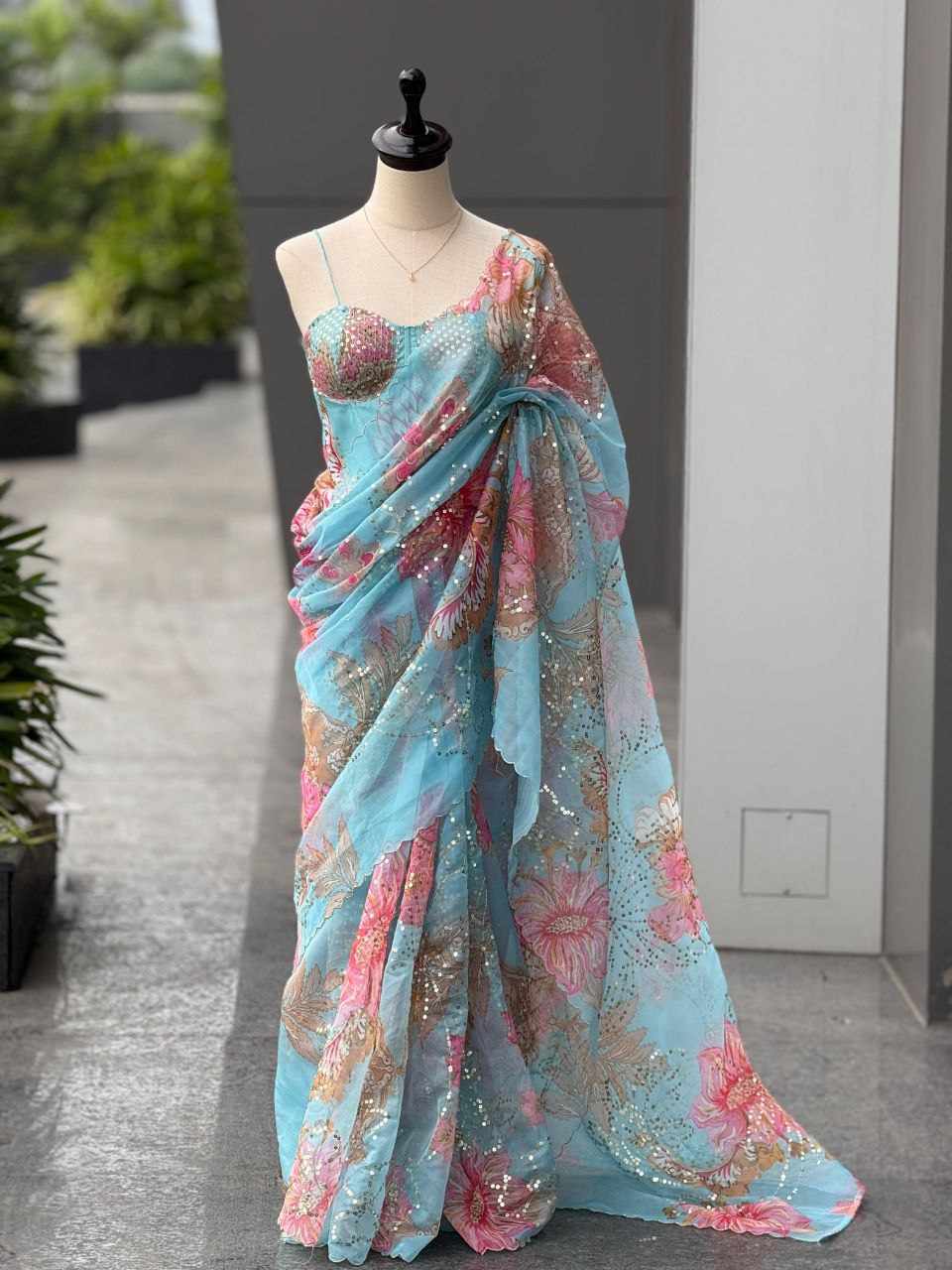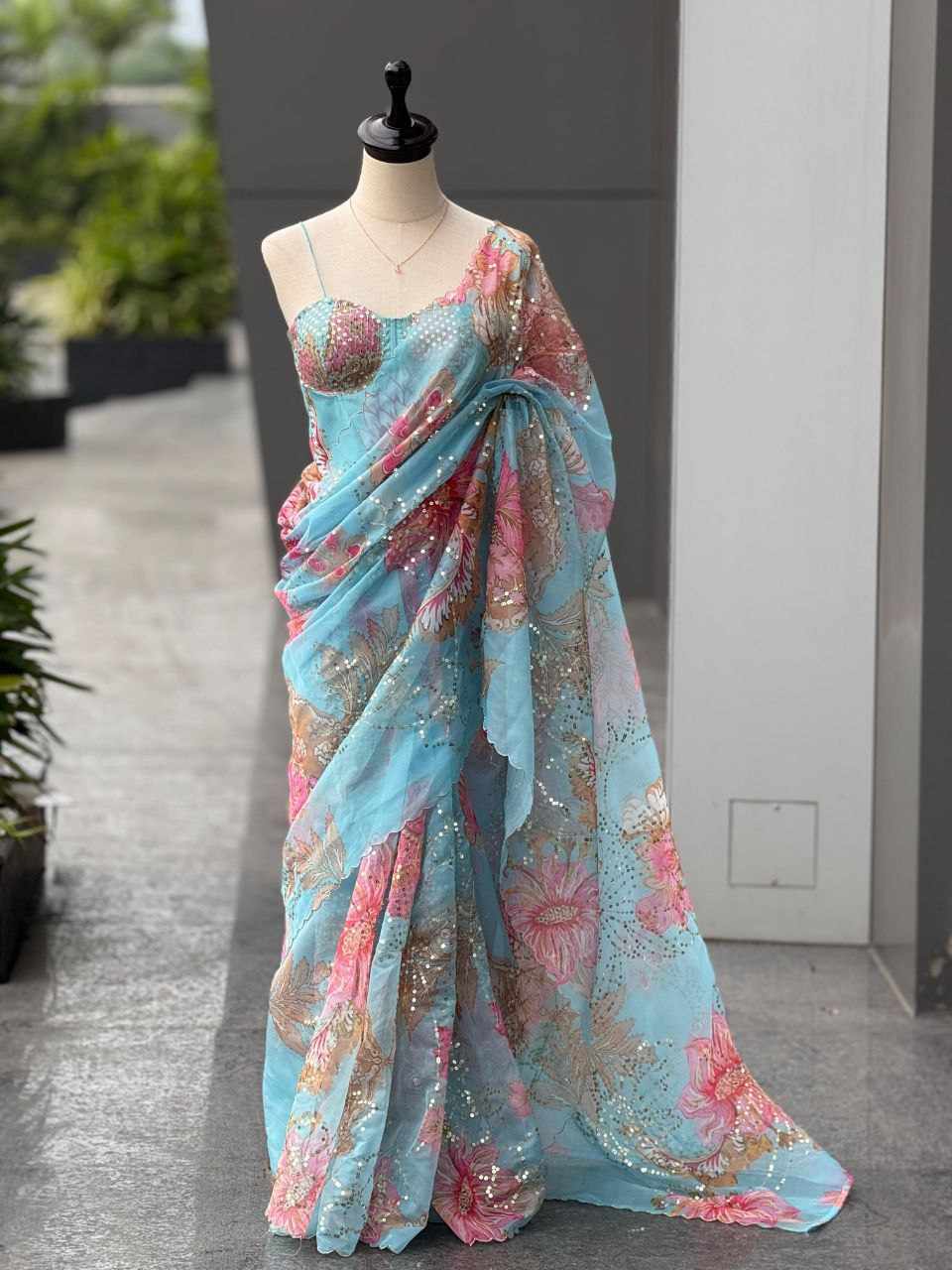 Saree – Pure Jimmy Organza digital printed saree embellished with beautiful sequins work, giving it a graceful and festive appeal